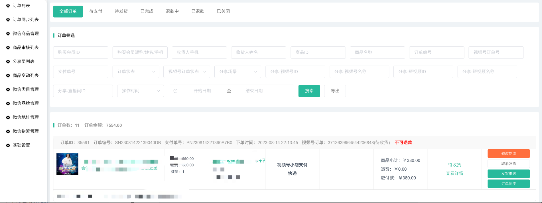 订单可进行筛选,按照购买会员ID,名称,收件人手机,姓名等,支持导出订单