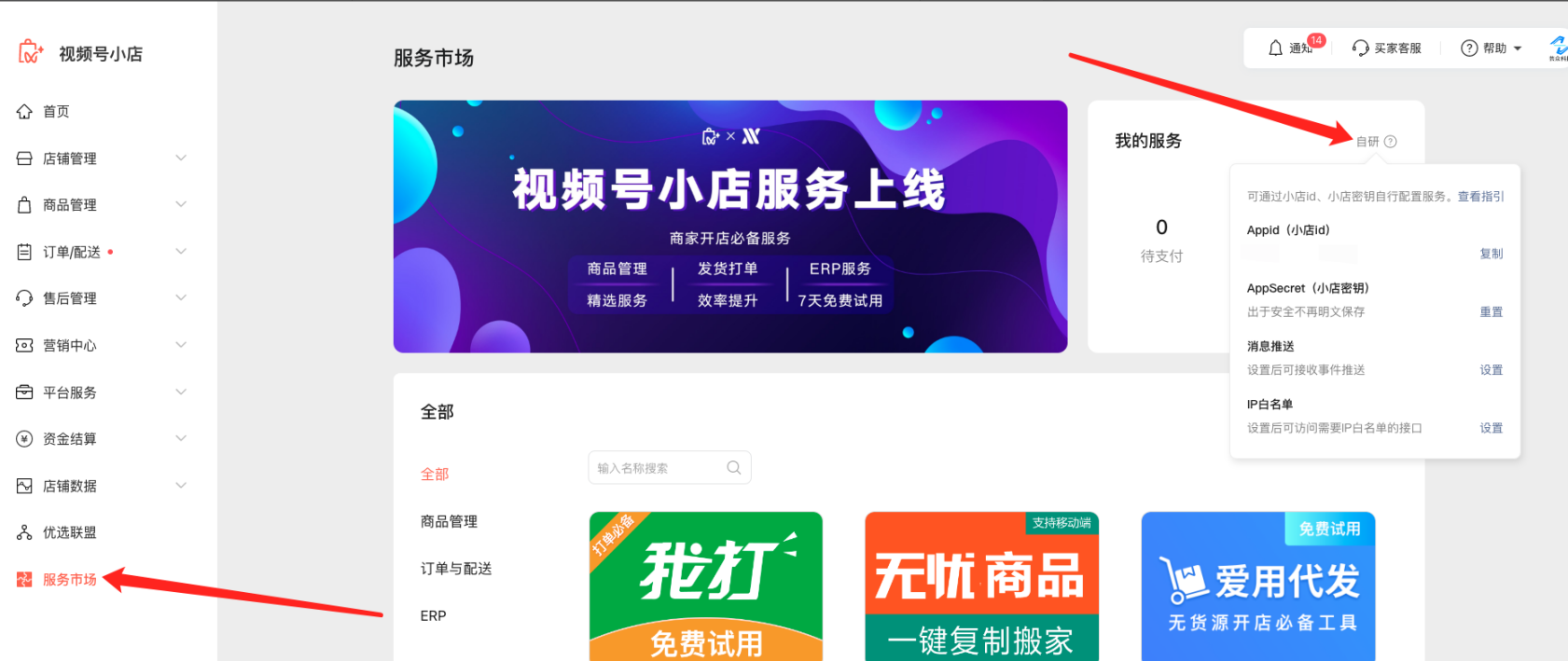 1. 信息在视频号小店https://channels.weixin.qq.com/shop 服务市场--自研处获取,获取信息这里只有超级管理员才能设置,IP白名单暂不用设置