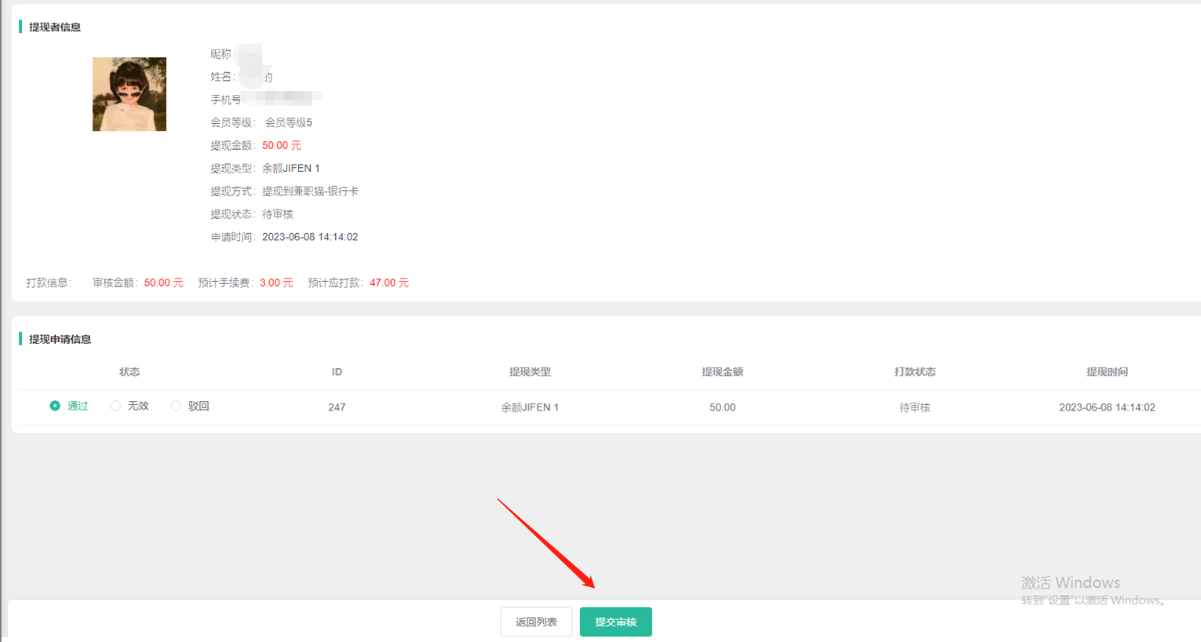 后台财务--提现记录--提交审核,审核打款