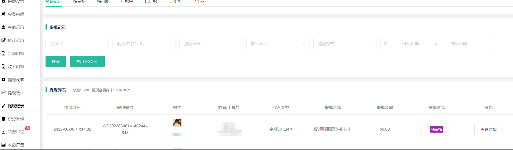 3. 打款列表:记录会员打款信息