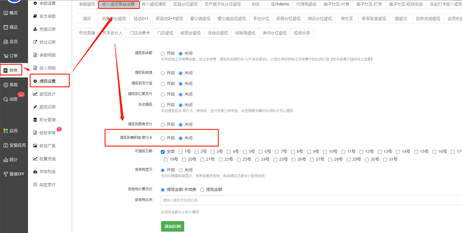 5. 财务—提现设置——财务提现/收入提现设置:新增兼职猫提现开关