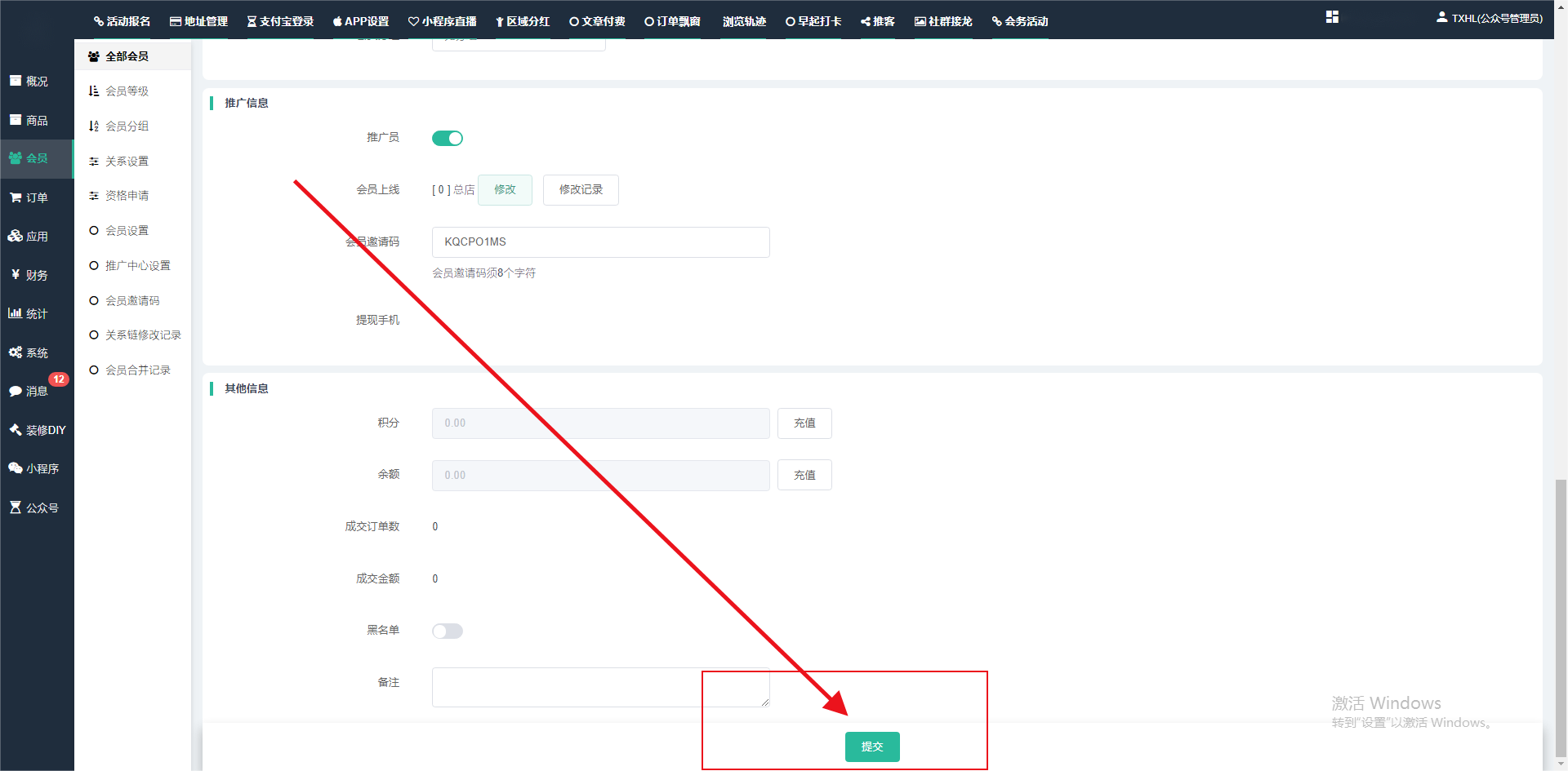 目录 搜索 展开 一、前期准备资料二、数字乡村码-上线操作指南1、服务号的申请流程及认证2、申请小程序流程3、开放平台绑定小程序和公众号三、数字乡村码-系统操作数字乡村码系统管理-概况数字乡村码-商品管理1、发布商品2、商品列表3、商品表单4、商品分类5、品牌管理6、配送模板7、评论管理8、优惠券管理9、商品标签10、退货地址设置11、满额优惠12、批量操作13、配送方式14、基础设置15、商品隐藏四、数字乡村码-会员管理1、全部会员2、会员等级3、会员分组4、资格申请5、会员设置6、推广中心设置7、会员邀请码8、会员关系链修改关系链修改记录9、会员合并记录10、账号注销管理11、会员设置中心五、数字乡村码-订单管理1、订单管理列表2、订单处理流程3、订单状态4、订单修改价格5、订单退款退货6、多包裹发货7、批量发货订单操作步骤8、催发货订单9、物流查询六、数字乡村码-财务管理1、余额设置2、会员余额3、充值记录4、转让记录5、余额明细6、收入明细7、提现设置8、提现统计9、积分管理10、转账审核11、收益广告12、批量充值七、数字乡村码-系统管理1、商城入口2、商城设置①、商城设置②、订单设置③、物流查询④、短信⑤、联系方式⑥、分类⑦、优惠券⑧、分享⑨、幻灯片⑩、广告位⑫、地图设置3、交易设置4、微信模板消息自定义消息模板(新版)自定义消息模板(旧版)小程序消息模板公众号模板消息变更公告5、语言设置6、权限管理7、多媒体管理八、数字乡村码-消息管理九、数字乡村码-应用管理十、数字乡村码系统-数据统计十一、数字乡村码-页面装修DIY1、模板管理2、店铺页面3、顶部导航4、底部导航5、DIY模板市场6、首屏广告7、基础设置8、装修DIY尺寸建议十二、供应商功能插件操作指南1、供应商2、门店-收银台门店申请和使用步骤门店管理①、门店-收银台 营销设置②、门店-收银台 分润设置门店分类门店申请门店审核门店商品门店商品订单收银台订单数据统计核销员基础设置默认设置门店装修3、微社区4、会务活动十三、营销插件操作指南活动报名提货卡新人奖微店问卷调查积分视频分享1、视频分享基础设置2、视频分享发现管理3、视频分享分类管理4、视频分享评论管理5、视频分享分红记录6、视频分享短视频中心每日红包幸运大抽奖签到优惠券二维码任务奖励优惠劵文章音频文章付费文章限时购新海报拓客卡操作流程积分活动素材中心视频红包十四、入驻门店应用类1、门店预约2、附近商品3、门店定位设置4、门店控制5、门店满额包邮6、门店满额减7、导入商品8、门店搜索9、门店股东10、核销券11、多门店核销1、商城后台设置2、前端功能演示十五、常见问题1、后台登录密码修改流程2、会员-余额,积分,后台如何进行充值与扣除3、如何修改上下级关系4、一种万能的获取商城小程序路径的方法 暂无相关搜索结果! 阅读次数:1521 本文档使用 模王系统 发布 3、如何修改上下级关系 如何修改上下级关系一.如何修改上下级关系?1.会员-全部会员-可以通过搜索用户的独立ID,或者用户微信昵称,找到此会员,然后点击右边的(操作)2.再点击会员详情。3.滑到下面,有个推广信息-会员上线,点击修改4.输入上级的ID号,点击搜索,出来此上级会员后点击选择。5.滑到最下面,一定要点击提交按钮。文档更新时间: 2024-01-05 14:50 作者:链上旅行
